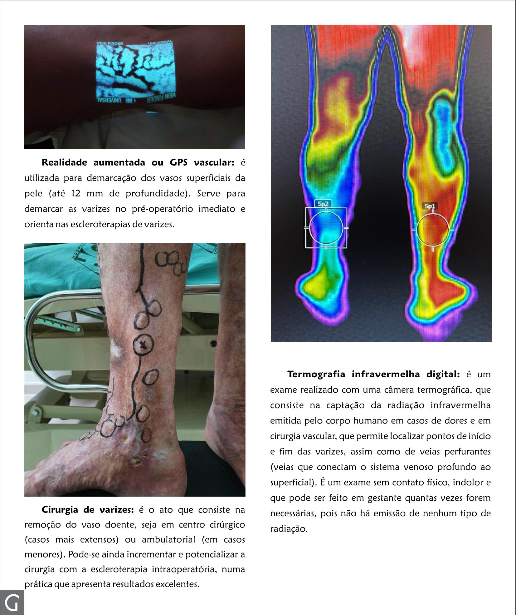 Realidade aumentada ou GPS vascular: é utilizada para demarcação dos vasos superficiais da pele (até 12 mm de profundidade). Serve para demarcar as varizes no pré-operatório imediato e orienta nas escleroterapias de varizes.