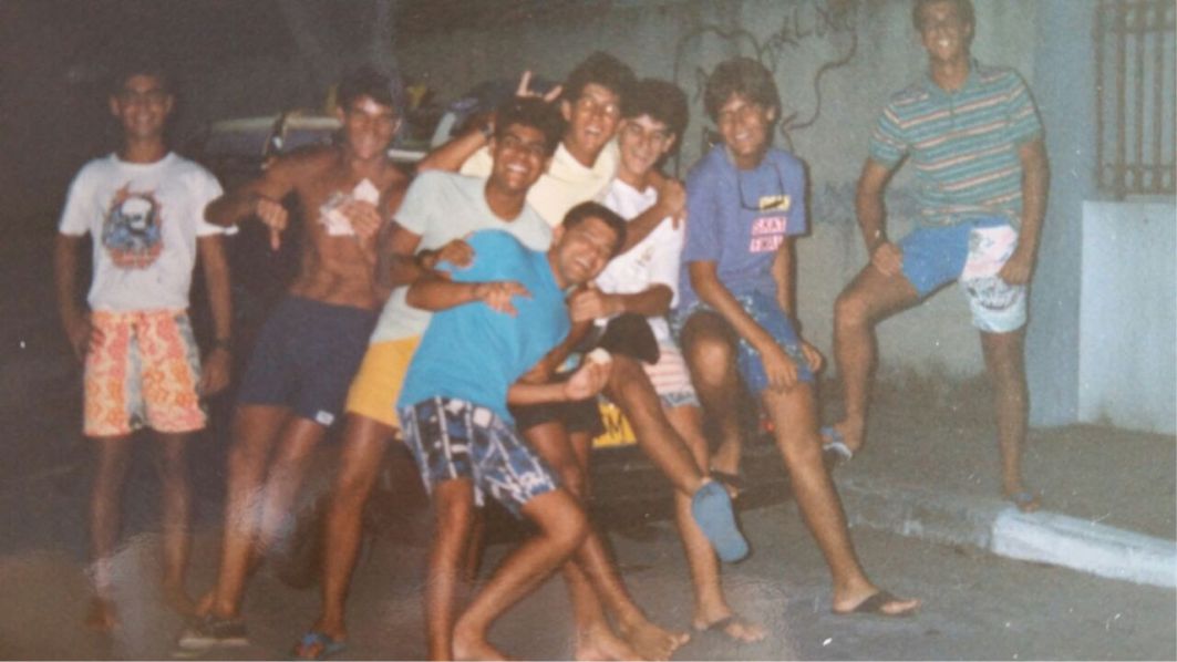 Da rua para a calçada: Sander, Giovanni Sartório, Túlio, MaurÃcio "Hot Summer" (de camisa azul), Alexandre Vervloet, Cezinha Sartório, Casotti e Marcelo Nolasco. Ao fundo, o muro da casa do nosso saudoso amigo, Marcelo "TT". Deste muro, a gente se atirava com skate e tudo pra calçada abaixo. Pergunta se de vez em quando o skate quebrava...