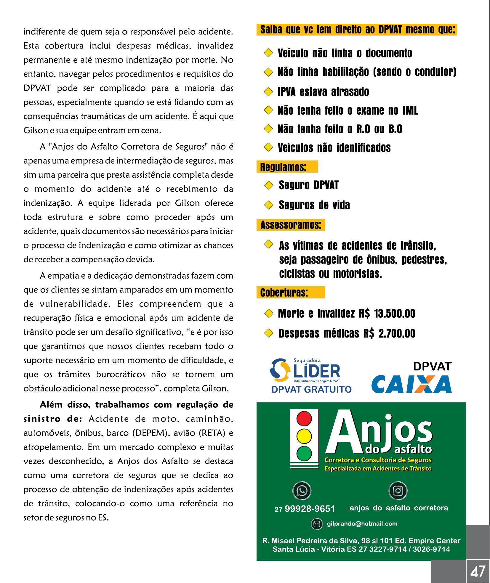 O Guia Grande Vitória conversou com o Gilson Prando, proprietário da Anjos do Asfalto. Com uma vasta experiência e profundo entendimento do mercado de seguros, Gilson é um corretor autorizado que se especializou em acidentes de trânsito e áreas correlatas. Sua empresa, "Anjos do Asfalto Corretora de Seguros", conquistou reconhecimento por oferecer serviços de consultoria abrangentes em casos de acidentes automobilísticos, focando especialmente no seguro DPVAT, bem como em seguros de vida e passageiros de ônibus.